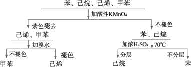 本题鉴别几种物质,要求方法简单,现象明显.先用酸性KMnO4溶液可以分出两组:即不褪色的是第一组:苯、己烷;使KMnO4溶液褪色的为第二组:己烯、甲苯.再用浓H2SO4和溴水可以分别检验第一组、第二组两种物质. |
