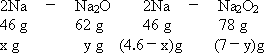 答案:产物由Na2O和Na2O2组成,其质量分别为3.1 g和3.9 g. 由此看出,7 g产物中既有Na2O,又有Na2O2. 设有x g Na反应生成y g Na2O,则有(4.6-x)g Na反应生成(7-y)g Na2O2. 则有 |