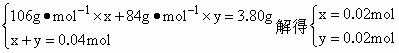 答案:(1)1同样50 mL盐酸,第1组产生的CO2气体最少,说明盐酸有剩余 (2)Na2CO3:2.12 g NaHCO3:1.68 g 解析:(1)同样50 mL盐酸,第1组产生的CO2气体最少,说明盐酸过量. (2)生成A的反应可能有: 2NaOH+CO2 NaOH+CO2 第1组样品与盐酸反应生成CO2的物质的量为: 若CO2全部是由Na2CO3产生的,则其物质的量小于0.04 mol;若CO2全部是由NaHCO3产生的,则其物质的量大于0.04 mol,因此可判断出A为Na2CO3与NaHCO3的混合物. 设A含Na2CO3、NaHCO3的物质的量分别为x、y. m(Na2CO3)=0.02 mol×106 g·mol-1=2.12 g m(NaHCO3)=0.02 mol×84 g·mol-1=1.68 g |