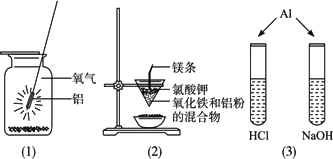 (1)现象:铝在氧气中燃烧,生成白色固体物质,放出大量的热. (2)现象:当外露部分镁条刚刚燃烧完毕,纸漏斗内的混合物立即剧烈反应,发出耀眼的强光,产生大量的白烟,纸漏斗被烧破,有红热状态的液珠落入蒸发皿内的细沙上,液珠冷却后变为黑色固体. (3)现象:铝逐渐溶解,有无色气泡逸出. 通过铝与O2、Fe2O3、HCl等氧化性的物质发生反应,在反应中失去电子,作还原剂,具有还原性,即可证明. |