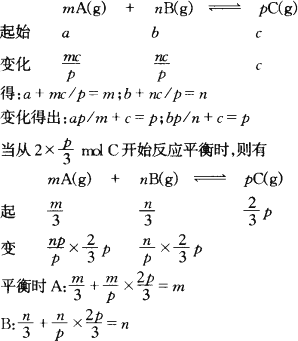 在一个固体的密闭容器中,加入m mol A,n mol B,发生下列反应: mA(g)+nB(g) 平衡时C的浓度为a mol·L-1若容器体积和温度不变起始放入a mol A,b mol B,c mol C,若要平衡后C的浓度仍为a mol·L-1,则a、b、c可以满足的关系是 | |