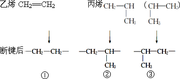 单烯作为单体加聚后的聚合物中不可能还保留双键,所以应先排除C. ①和②连接为B,①和③连接则为A,从丙烯的断键不难看出,形成的聚合物链节上必然会出现一个-CH3侧链,则D式肯定不正确. 应该注意的是:A、B两种表达式实质结构相同,因为n很大时,均为每隔3个碳原子就出现一个-CH3.故答案为A、B. |