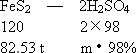 根据接触法制硫酸的有关反应可得关系式: FeS2-2H2SO4 各步反应中硫元素的损失、转化都可归于黄铁矿的硫元素上,则100 t黄铁矿中实际用于生产硫酸的FeS2的质量为: 100 t×95%×(1-5%)×92%×(1-0.6%)=82.53 t. 设可制得98%的浓硫酸的质量为m,则 120∶2×98=82.53 t∶m·98%, 解得m=137.55 t. |