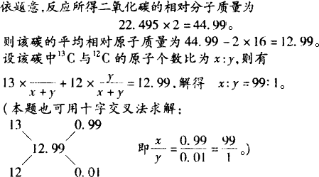一定量的碳(由12C和13C组成)与足量的氧气(由16O组成)反应所得的二氧化碳对氢气的相对密度为22.495,求该碳中13C和12C的原子个数之比.