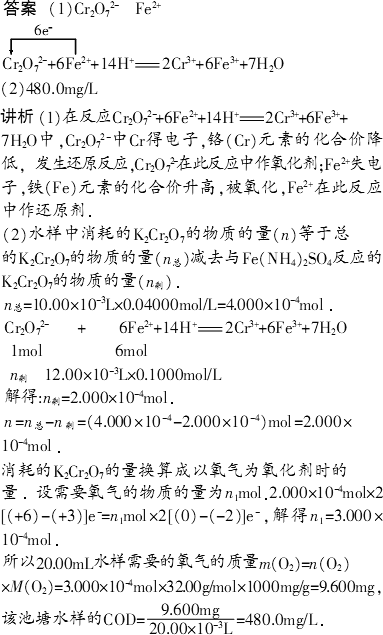 化学需氧量(COD)是水体质量的检测项目之一,COD是指用强氧化剂[我国采用重铬酸钾(K2Cr2O7)]处理一定量的水样时消耗的氧化剂的量,并换算成以氧气为氧化剂时,1 L水样消耗O2的质量(mg/L).现取某池塘中的水样20.00 mL,加入10.00 mL 0.04000 mol/L K2Cr2O7溶液,并加入适量酸和催化剂,加热反应2h,剩余的K2Cr2O7用Fe(NH4)2(SO4)2溶液反应.经测定,需用0.1000 mol/L Fe(NH4)2(SO4)2溶液12.00 mL,此时发生反应的离子方程式为Cr2O72-+6Fe2++14H+