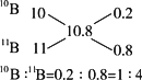 解法一:设10B的原子百分比为x,则有相对原子质量的计算式10.8=10x+11(1-x),解出x=0.2,则10B与11B的原子个数比为1∶4. 解法二:十字交叉法