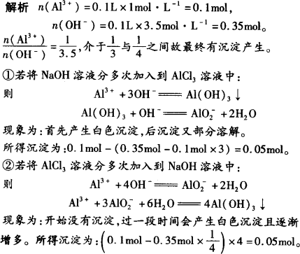 有100 mL 3.5 mol·L-1 NaOH溶液和100 mL 1 mol·L-1 AlCl3溶液.按如下两种方法进行实验: ①将NaOH溶液分多次加入到AlCl3溶液中(边加边搅拌); ②将AlCl3溶液分多次加入到NaOH溶液中(边加边搅拌). 比较两次实验的结果,其中正确的是( ). | |