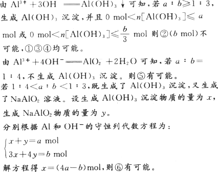 向含有a mol AlCl3的溶液中加入含b mol NaOH的溶液,生成沉淀的物质的量可能是 ①a mol ②b mol ③ | |