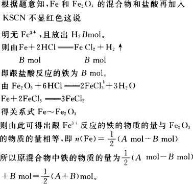 铁和氧化铁的混合物共A mol,加盐酸后固体全部溶解,共收集到B mol H2,且溶液中加入KSCN溶液不显红色,则原混合物中铁的物质的量是多少?