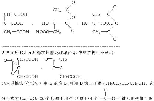 ¡¡¡¡£¨2£©£¨Êغ㷨/ÄæÍÆ·¨£©£º¸ù¾ÝÔ×Ó¸öÊýÊØºã£º ¡¡¡¡C2H4O2£«E¡úCH3COOOH£«H2O ¡¡¡¡ÄæÍÆ¿ÉÖªEΪH2O2£¬¸ù¾ÝCH3COOOHÄæÍÆ¿ÉÖªBΪCH3COOH£¬ÔòB£«EµÄ·´Ó¦Îª£º ¡¡¡¡CH3COOH£«H2O2¡úCH3COOOH£«H2O ¡¡¡¡£¨3£©CµÄ·Ö×ÓʽΪC6H8O7£¬ÓÉC·Ö×Óµ½D·Ö×ÓÍÑÈ¥ÁË1·Ö×ÓH2O£¬C·Ö×ÓµÄÍÑË®·½Ê½ÓжàÖÖ£¬Òò¶øFµÄ½á¹¹ÓжàÖÖ£º ¡¡¡¡ ¡¡¡¡A£º ¡¡¡¡¡¡¡¡B£«C£«3D ¡¡¡¡ ¡¡¡¡ ¡¡¡¡