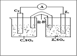 (5分)有铜片、锌片、若干小烧杯、导线、、盐桥(含琼胶的KCl饱和溶液)、电流计、ZnSO4溶液、CuSO4溶液,试画出原电池的装置图,并说明其工作原理。