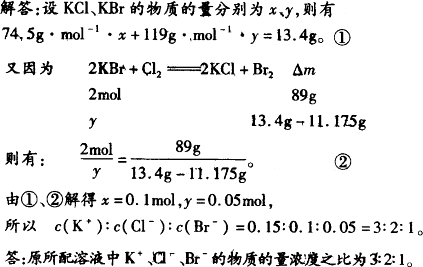 将KCl和KBr混合物13.4 g溶于水配成500 mL溶液,通入过量的Cl2,充分反应后将溶液蒸发至干,得固体11.175 g,求原所配溶液中K+、Cl-、Br-的物质的量浓度之比.
