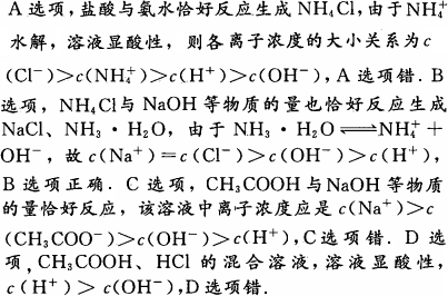 10 mL 0.1 mol·L-1氨水与10 mL 0.1 mol·L-1盐酸混合:c(Cl-)>c(NH |