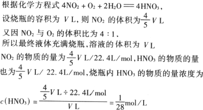在标准状况下,将O2和NO2按1∶4的体积比充满干燥的烧瓶,把烧瓶倒置于水中,瓶内液体逐渐上升,假设烧瓶内溶液不扩散,最终烧瓶内溶液溶质的物质的量浓度为 | |
