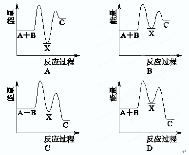 反应A+B→C(ΔH<0)分两步进行:①A+B→X(ΔH>0),②X→C(ΔH<0).下列示意图中,能正确表示总反应过程中能量变化的是 | |