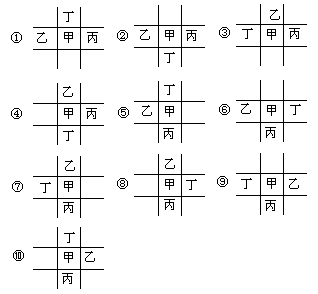 设甲最外层电子数为x,则①②③⑥⑨中有4x=20,解得x=5;而④⑤⑦⑧⑩中有4x±1=20,x不是整数,不合理.故甲最外层为5个电子为ⅤA族,此时①②③⑥中丙原子序数均不可能是乙、甲元素原子序数之和,而⑨中甲为氮,乙为氧、丙为磷、丁为碳,满足题目要求. 本题也可直接通过假设讨论求解:若丙在甲之后,则乙必为H,很显然不可能保证相邻元素最外层电子数之和为20,若丙在甲之下,则乙元素原子序数应为8,故乙为氧,由四种元素最外层电子数为20可知甲应为氮不为氟,故丙为磷,丁为碳. |