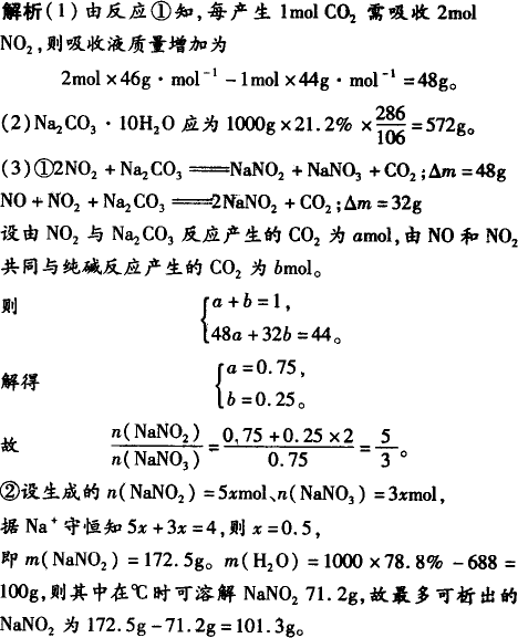 (3)现有1000 g质量分数为21.2%的纯碱吸收液,吸收硝酸工业尾气,每产生22.4 L(标准状况下)CO2时,吸收液质量就增加44 g.