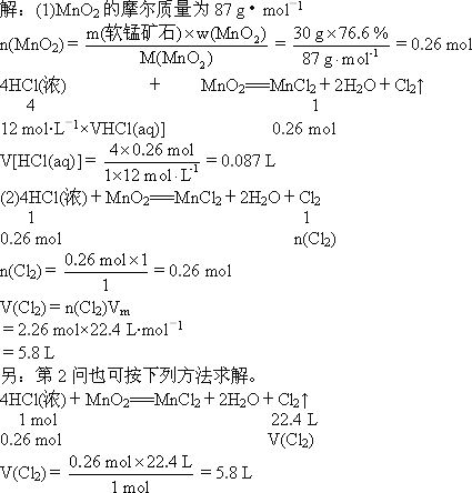 答:参加反应的浓HCl的体积为0.087 L,生成Cl2的体积在标况下为5.8 L. 解析:根据题目中所给的已知条件,可先计算出参加反应的MnO2的物质的量n(MnO2),然后根据化学反应中各物质之间的化学计量数之比,来计算所求数值. |