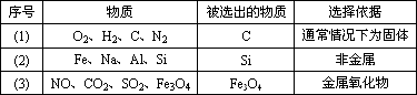 | 序号 | 物质 | 被选出的物质 | 选择依据 |