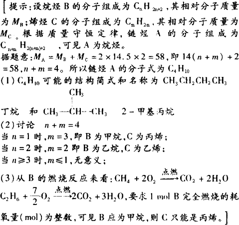 某链烃A 1 mol,在一定条件下完全分解(裂解)成1mol烷烃B和1 mol烯烃C,生成的混合气体对氢气的相对密度为14.5.通过计算回答下列问题: