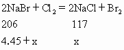 解:设生成NaCl为x g,则未反应的NaBr为6.55g-x g. 反应的NaBr为11-(6.55-x)=4.45+x(g) x=5.85g 答:生成NaCl5.85g. |