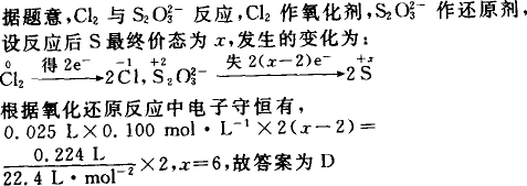 硫代硫酸钠可作为脱氯剂,已知25.0 mL 0.100 mol·L-1 Na2S2O3溶液恰好把224 mL(标准状况下)Cl2完全转化为Cl-,则 | |