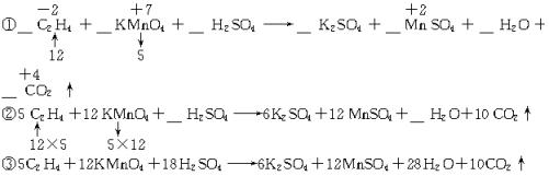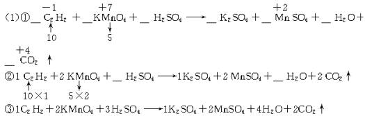 已知乙炔、乙烯都能使酸性KMnO4(aq)褪色,其反应方程式分别如下,请配平: ![]()