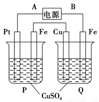 Cu溶解,则说明Cu是阳极,则与Cu相连的A是电源的正极.在乙中发生的电镀反应,乙池中Cu2+的浓度保持不变.Pt电极也是阳极,放出O2,体积是Fe电极上产生H2的一半.