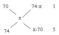 因此(74-x):(x-70)=1:5,解得x=73.3 |