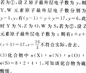 答案:(1)否 若三者处于同一周期,则最外层电子数之和不可能为17 (2)N O S (3)硫酸铵[(NH4)2SO4]