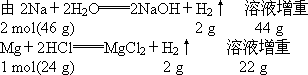 题目要求比较两个质量A和B的关系,那就要分析水中加入钠增重和逸出的氢气的总和与盐酸中镁增重和氢气逸出的总和的大小. 可见,消耗0.5 mol Na和0.5 mol Mg,两溶液增重各11 g,因为m1=m2,所以A=B. |