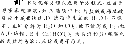 方法技巧:Ca(OH)2微溶,若Ca(OH)2作反应物时,如为澄清石灰水,则拆成离子形式,如为石灰乳应写分子形式;若Ca(OH)2为生成物,一般作为沉淀处理.对其他微溶物的处理同Ca(OH)2. |