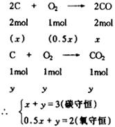 ① 设反应后的氧化物只有 3mol×28g/mol = 84g 与题给100g不符,不合理。 设反应后的氧化物只有 3mol×44g/mol = 32g>100g,不合理。 ∴生成的氧化物为 ②设生成 解之,x = 2mol,y = 1mol 用所得数据检验是否合理