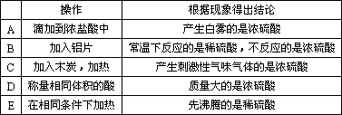 某研究小组成员在讨论鉴别浓硫酸和稀硫酸的方案时,设计如下方案: