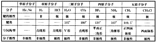 | 分子 | 键的极性 | 键角 | 空间构型 | 分子极性 |