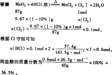 含杂质10%的MnO2固体9.67 g跟过量的浓盐酸60 g反应,当生成的氯气充分排出后,向反应液中加入足量的硝酸银溶液生成沉淀57.4 g,求原盐酸溶液的质量分数.