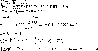在500 mL 0.1 mol·L-1的FeCl2溶液中,通入一定量Cl2,待反应结束后,将溶液稀释到1 L,再取出1/10稀溶液,加入足量的AgNO3溶液,共得到2.009 g沉淀.问:原溶液中的Fe2+是否完全被氧化?若未完全氧化,试求Fe2+被氧化的质量分数(不考虑Cl2与H2O的反应).