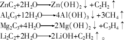 CaC2、ZnC2、Al4C3、Mg2C3、Li2C2等都属于离子型碳化物.请通过对CaC2制C2H2的反应进行思考,从中得到必要的启示,判断下列反应产物正确的是 | |