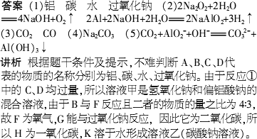 (均由短周期元素形成)之间的转化关系,其中A为常见的金属单质,B为非金属单质(一般是黑色粉末),C是常见的无色无味液体,D是淡黄色的固体化合物(反应条件图中已省略).(1)A、B、C、D代表的物质分别为________、________、________、________(填物质名称).