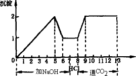 在含1 mol Mg2+和1 mol Al3+的混合溶液中,现按横坐标依次加入NaOH溶液,加入盐酸,通入CO2气体,纵坐标为混合沉淀物的物质的量如图所示.请画出沉淀的量随反应过程的变化曲线,并写出各步反应的离子方程式________,________,________,________,________.