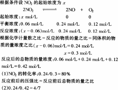 答案:(1)NO2的转化率为80% (2)反应前后的压强比为4∶7 分析:要求NO2的转化率需要求得NO2的起始浓度和平衡浓度;要求反应前后的压强比需求的起始条件下物质的总浓度和平衡总浓度. |