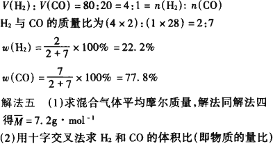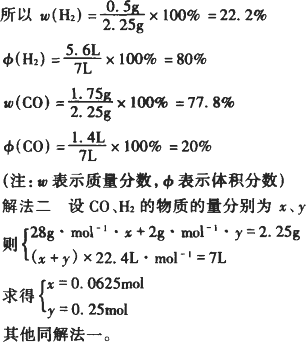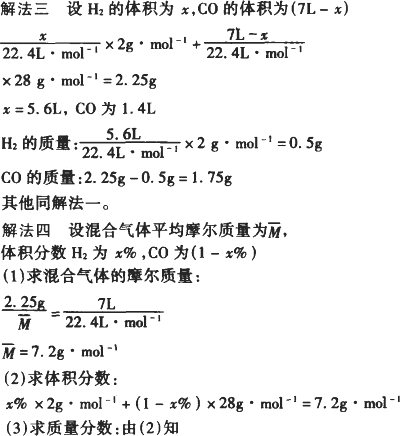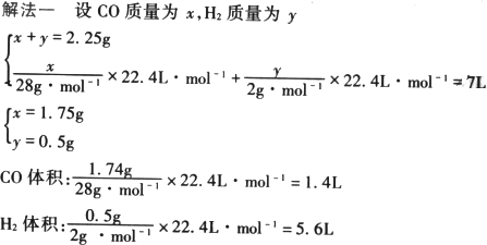 在标准状况下氢气和一氧化碳的混合气体7 L,质量为2.25 g,求H2和CO的质量分数和体积分数.(试试你能找出多少种解法)