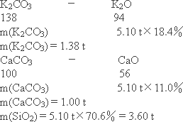 钾玻璃中含有18.4%的K2O、11.0%的CaO、70.6%的SiO2.计算三种氧化物的物质的量之比,用氧化物的形式表示钾玻璃的组成.若需制造5.10 t钾玻璃,需用碳酸钾、石灰石和二氧化硅各多少吨?写出制取钾玻璃的反应方程式.