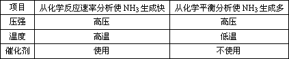 从上表可知,在实际生产中,选择合成氨的适宜条件为:①从动力、材料和设备这三方面考虑,通常采用2×107~5×107 Pa的压强,而不采取尽可能高的压强;②从达到平衡所需的时间和催化剂活性温度考虑,一般选择500℃左右的温度;③从加大氮气和氢气合成氨的反应速率考虑,要使用催化剂. |