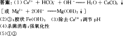 思路分析:药剂法是软化硬水的一种重要方法,加入Ca(OH)2后会使原液中Mg2+、HCO3-、Ca2+发生反应分别生成Mg(OH)2、CaCO3沉淀等.在水中因为用Cl2杀菌消毒,FeSO4·7H2O最终将变为Fe(OH)3.在该作用中要求使用物质必须具有强氧化性,而给出的物质中Ca(ClO)2、K2FeO4都具有强氧化性. |