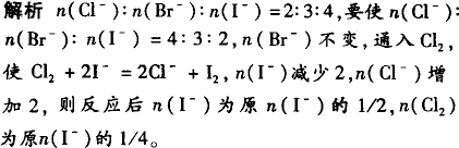 某溶液中Cl-、Br-、I-的物质的量之比是2∶3∶4,要使溶液中Cl-、Br-、I-的物质的量之比为4∶3∶2,则通入氯气的物质的量是原溶液中I-的物质的量的( ). | |