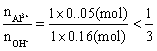 Al3+与OH-在OH-不足量或适量条件时,生成Al(OH)3沉淀,而在OH-部分过量时,沉淀可溶解一部分,但仍有沉淀。在此类计算中,一定要先判断Al3+与OH-量的关系,以确定发生的反应并用其计算生成Al(OH) Al3+ + 3OH- = Al(OH)3↓ Al(OH)3 + OH- = AlO2- + 2H2O 1 mol 3 mol 1 mol 1 mol 1 mol ∵0.05 mol ∴0.05 mol ∴0.05 mol ∴ 0.01 mol ∵(0.16-0.15)mol