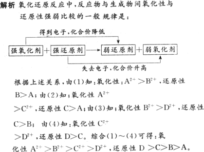 有A、B、C、D四种物质,已知它们能发生下列变化: (1)A2++B (2)A2++C (3)B2++C (4)C2++D 由此可推知,各物质的氧化性、还原性强弱顺序正确的是 | |