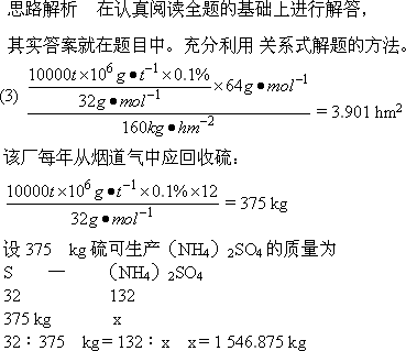 (3)某火力发电厂每月燃烧含硫0.1%的烟煤10000 t,若要吸收该厂排放的烟道气中的SO2,需要栽柳杉多少hm2?若该厂放烟道气之前用脱硫法处理,每年可回收多少千克硫?这些硫可制硫铵多少千克?