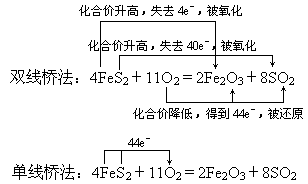 用双线桥法和单线桥法表示氧化还原反应4FeS2+11O2=2Fe2O3+8SO2中电子转移方向和数目.